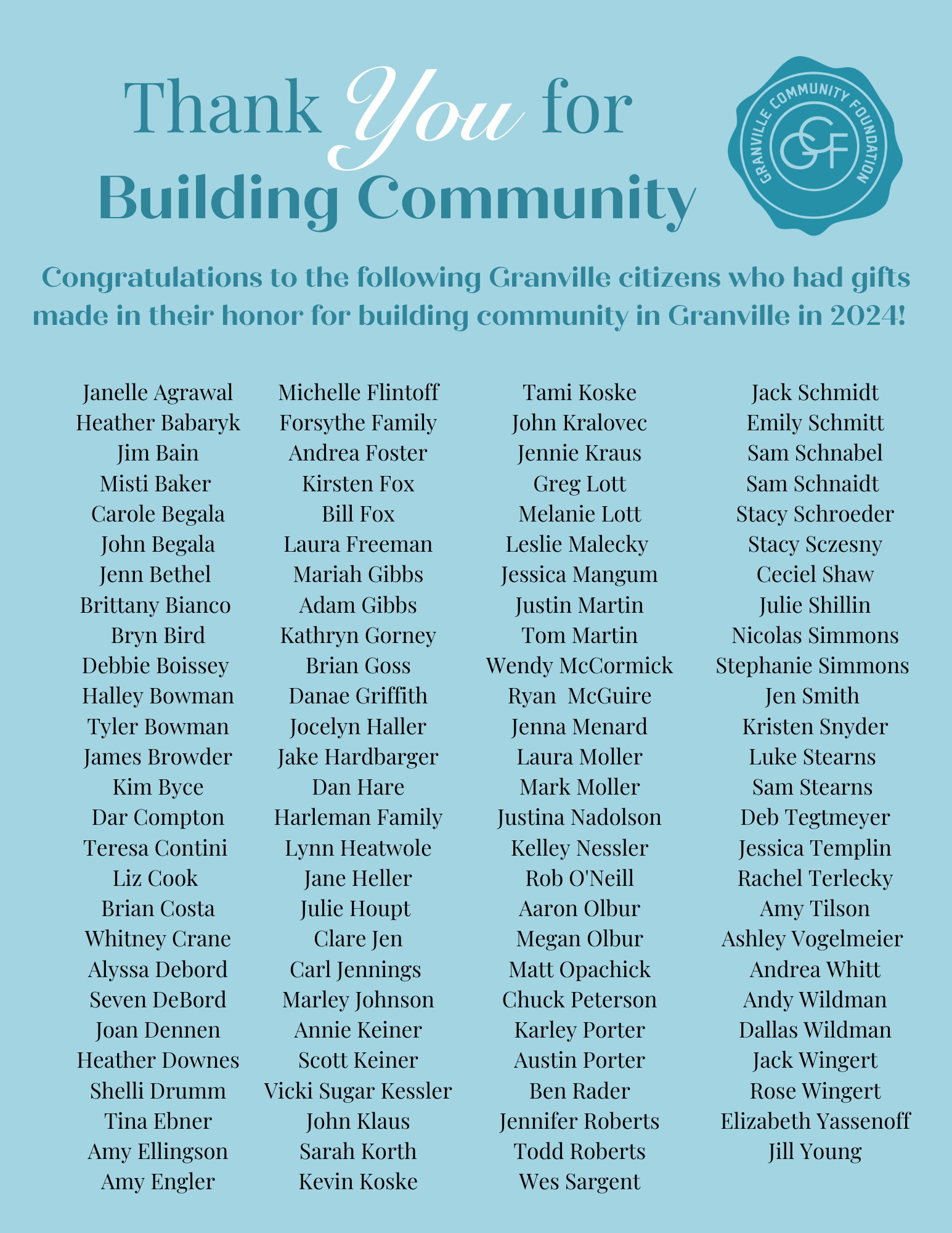 Between November 20 and December 31, join us in spreading joy and gratitude throughout Granville by recognizing someone who makes our community special. With a suggested gift of $10, you can celebrate a neighbor who’s always there to lend a hand or make a difference.